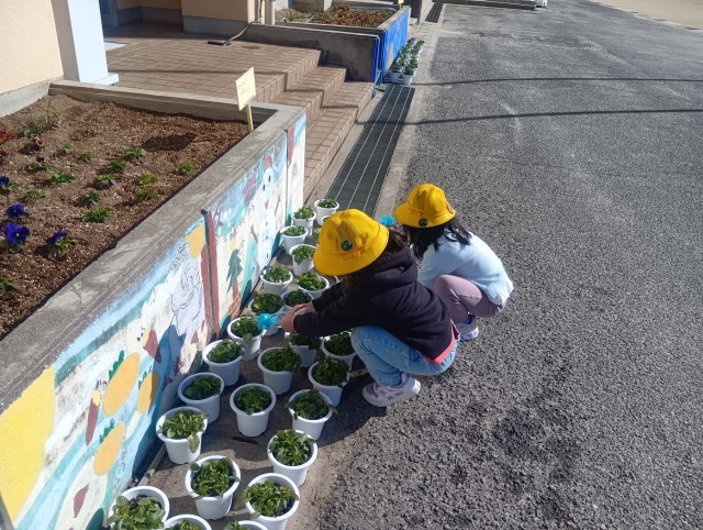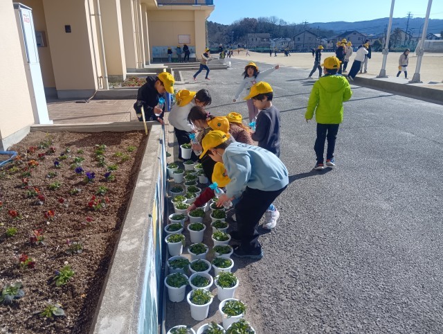 児童が「一人一鉢運動」で植えたパンジーのお世話をしています。卒業式にすてきな花をつけるようにと、3月に入るまではつぼみや花を摘み取ることにしています。また、天気のよい日は水やりもしています。心をこめて育てた花が3月に満開になることを願っています。