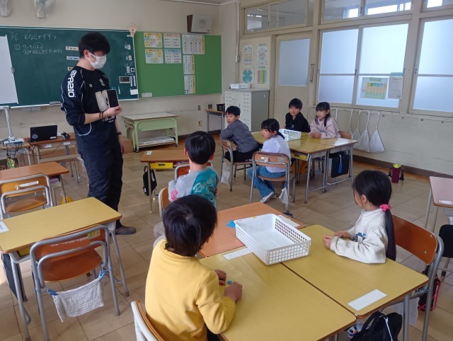 実際に分けてみた後は、その方法を他のグループへ発表しました。「1個ずつ配る」「2個ずつの方が速いよ」「6個ずつまとめて配ってみたよ」など、多様なアイデアが出されました。友達の説明を聞くことで、数え方や分け方の工夫に改めて気づくことができました。