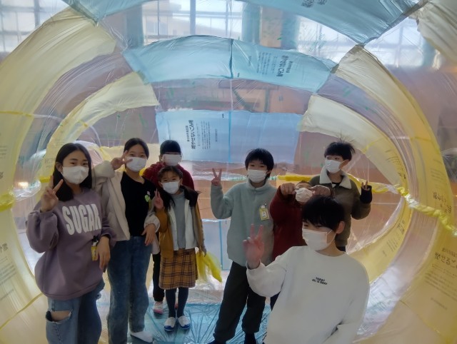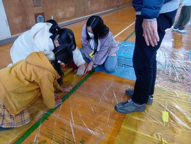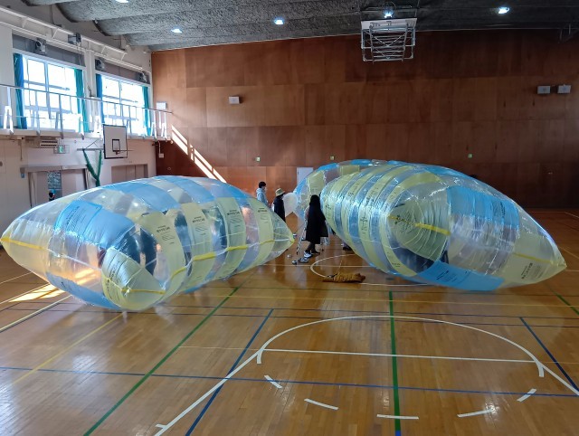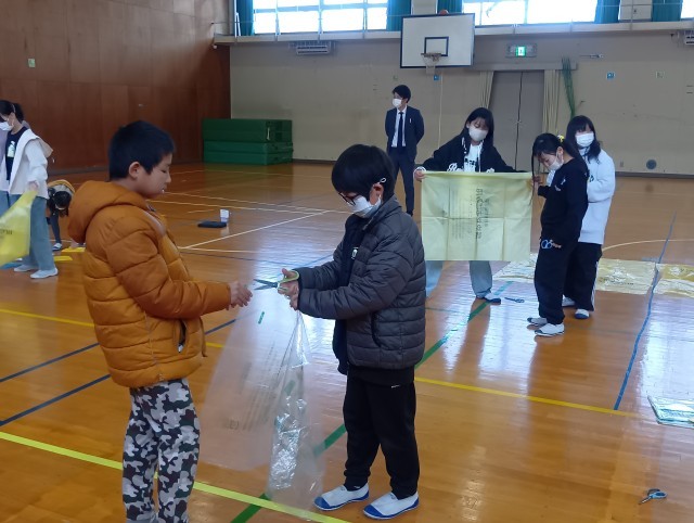 かすがい市民文化財団より林幸秀先生、画家の安藤シオンさん、羊水サヤさんをお招きし、巨大バルーンを作りに挑戦しました。まず66枚のビニール袋を切って広げ、それを貼り合わせ、大きな袋を作りました。「袋を切るこつが分かってきた」「うまいね」などと言い合いながら黙々と作業を続けました。貼り合わせた後は、扇風機で膨らませました。どんどん膨らむ袋を見ながらテンションが高まった子どもたちは、中から別の袋に入っている友達に手を振ったり、中で転がったりして楽しみました。次回は袋を外に出し、飾りつけをします。光の当たり方で見える世界が変わることを体感し、楽しみたいと思います。