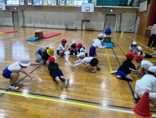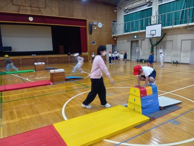 跳び箱の腕保持の感覚を身につけるため、準備運動にゲームをしました。跳び箱の台の前の方に貼られたテープに手をつくことを意識して、跳び箱に跳び乗る練習をしました。