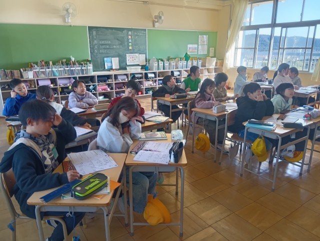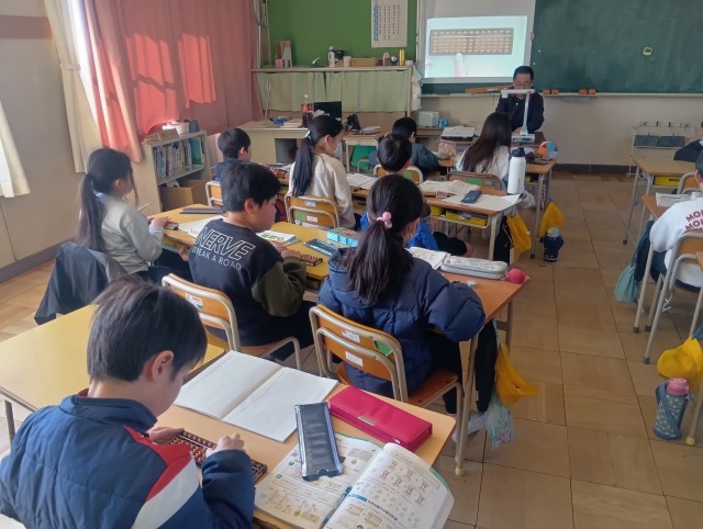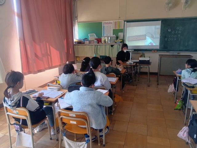 一人ずつそろばんを持ち、数を置いたり払ったりする練習をしました。そろばんに初めて触る児童もおり、親指と人さし指を使った操作に慣れようとがんばっていました。
