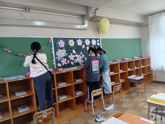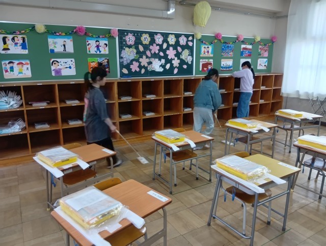新6年生が、入学式の準備を行いました。1年生をむかえるために何ができるのかを考えながら、会場や教室づくり、清掃を行いました。そのためあっという間に美しく仕上がりました。会場を飾る花の準備には、PTA生活環境部の方もお手伝いをしてくださいました。