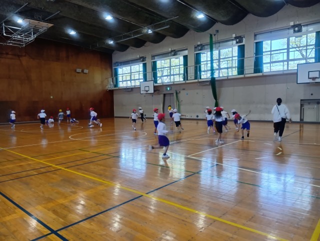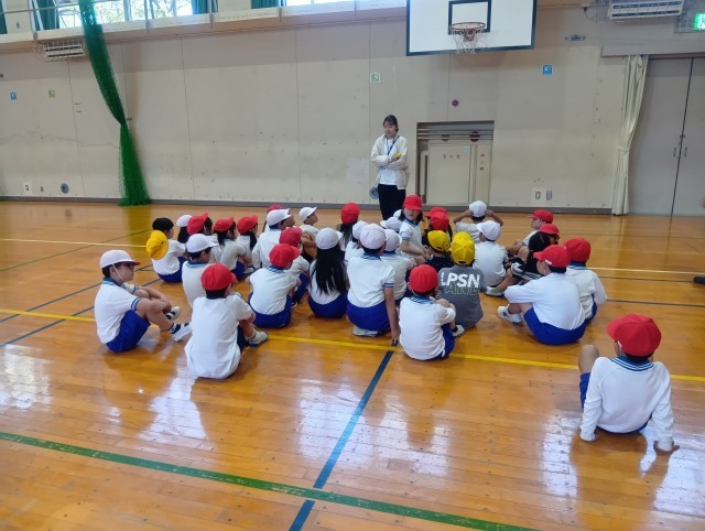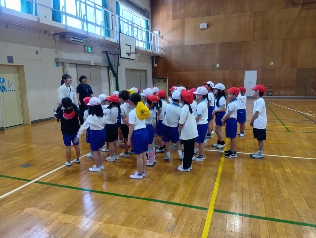 2年生は、2クラス合同で体育の学習を行っています。 今日は、先生が吹く「笛の合図」に合わせて、座ったり、集まったり、静かに話を聞いたりする練習をしました。合図の種類をしっかりと聞き分け、きびきびと動く姿に、2年生としての成長を感じました。