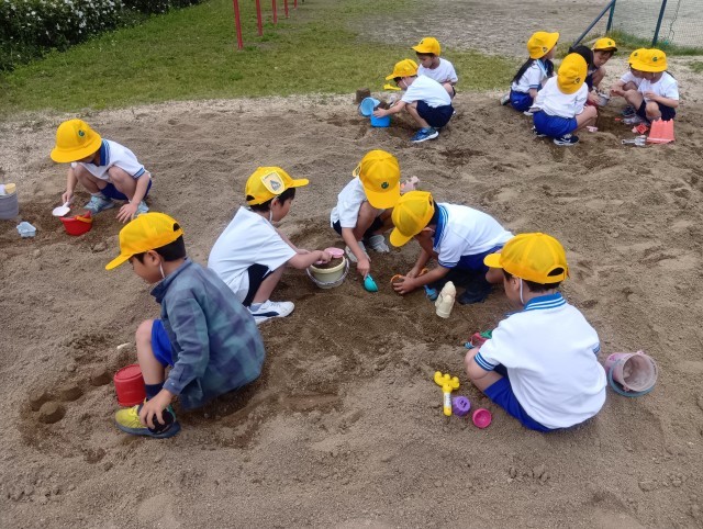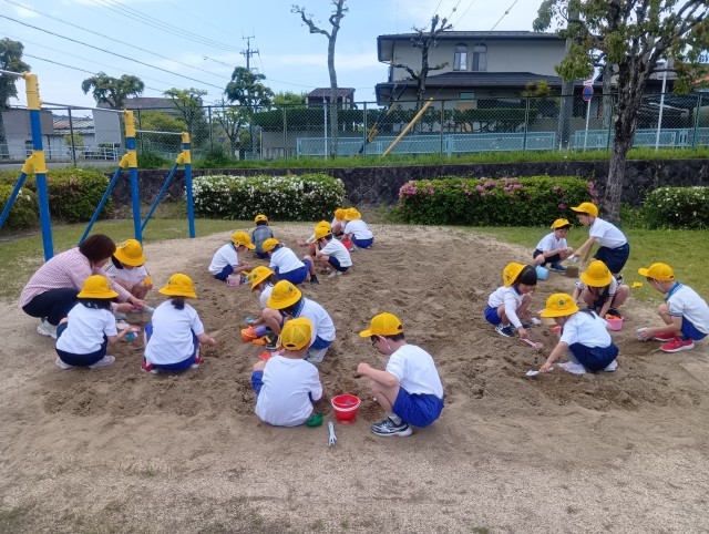 入学して早いもので1ヶ月が経ちました。今日は、生活科の時間に砂場遊びを楽しみました。