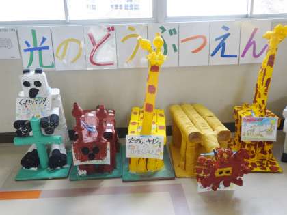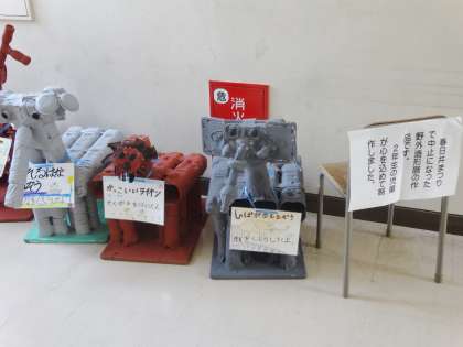 野外造形展で展示する予定だった2年生の作品が、2階に展示してあります。