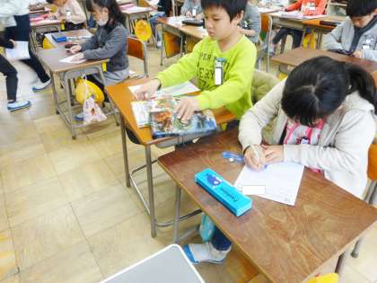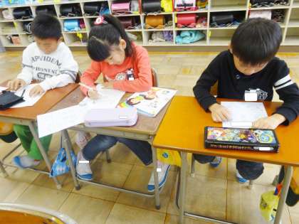 2-2は、算数で、「四角形と三角形」のプリントに取り組んでいました。