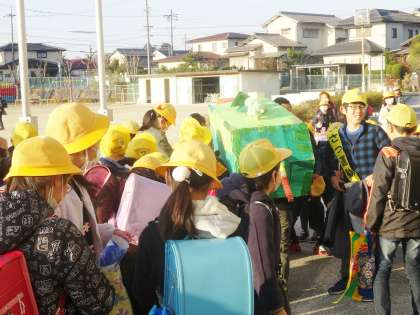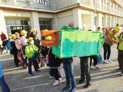 児童会が、ユニークな企画で、あいさつ運動を行ってくれています。朝、「おしざン」が登場しました。