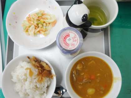 麦ごはん 牛乳 カレーシチュー  コーンサラダ 福神漬け