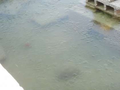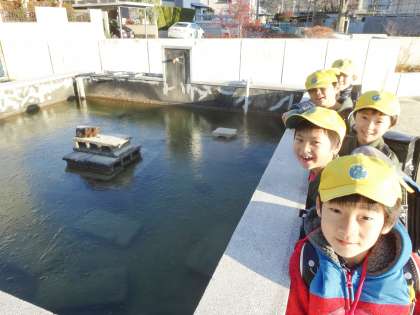 観察池が凍り、氷の下の金魚が泳いでいると知らせに来てくれました。
