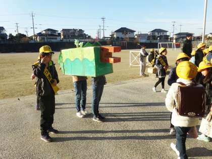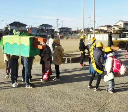 児童会が、ユニークな企画で、あいさつ運動を行ってくれています。朝、「おしざン」が登場しました。