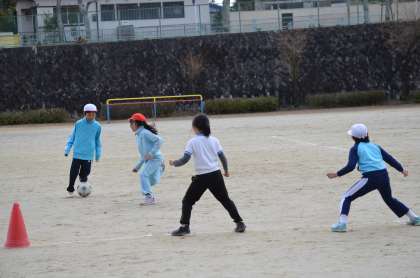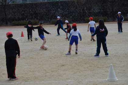 4年生が運動場で体育のサッカーをしていました。
