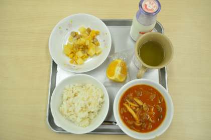 発芽げん米ごはん、牛乳、シェフのハヤシライス、コロコロポテトサラダ、いよかん、小ぶくろたまごなしマヨネーズ