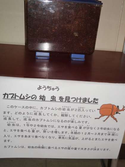 校長室の前に、カブトムシの幼虫を展示しました。これから、子どもたちに観察してもらいます。