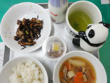 麦ごはん 牛乳 のっぺ汁 ひじきのうま煮 納豆