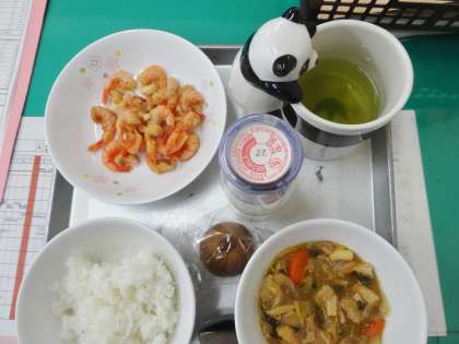 ごはん 牛乳 八宝菜 小えびとナッツの揚げ物 カットキウイフルーツ