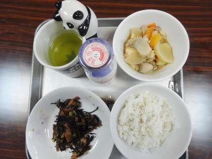麦ごはん 牛乳  里芋と大根の煮物 ひじきのうま煮 いかなごのくぎ煮