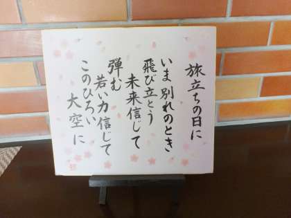来賓玄関に、「旅立ちの日」の歌詞の一部を書いた色紙が飾ってあります。
