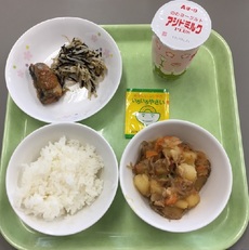ごはん  はっこう乳  肉じゃが  さんまのみぞれ煮 もやしとひじきの和え物  野菜ふりかけ