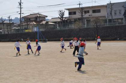 1年生が、運動場で体育をしていました。チーム対抗で、しっぽ取りをしていました。