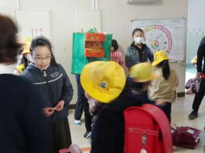 今年度最後のあいさつ運動を、児童会が行ってくれました。「おしザン」も登場しました。