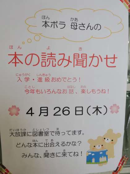 「本ボラお母さん」による第1回読み聞かせが、4月26日の木曜日にあります。