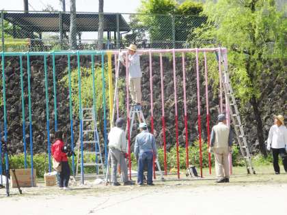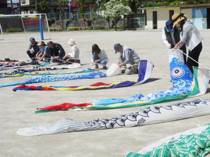 地域の方と保護者の方で、鯉のぼりの設置をしていただきました。