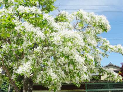 校庭の西側に、ヒトツバタゴ、別名ナンジャモンジャノキが、きれいにに咲いていました。