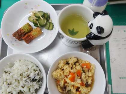 わかめごはん 牛乳  卵とじ  ちくわのお茶天ぷら  さっぱりづけ  ココアパウダー