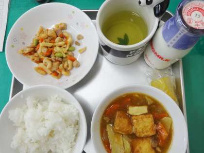 ごはん 牛乳 厚揚げカレー丼の具 鶏肉のカシューナッツ炒め 冷凍パイナップル