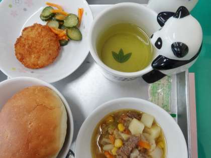 サンドイッチバンズパン 牛乳 牛肉の煮込みと春野菜のポットフー えびカツ きゅうりとにんじんのサラダ 小袋卵なしタルタルソース