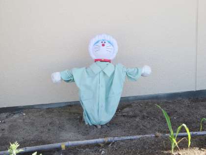 4組の野菜が植えてあるところに、かわいい案山子が立っていました。