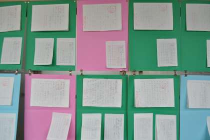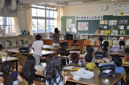 1年生は、図書室で本の借り方を担任から教えてもらっていました。