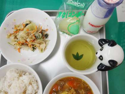 麦ごはん 牛乳 厚揚げカレー丼の具 おひたし 冷凍洋なし