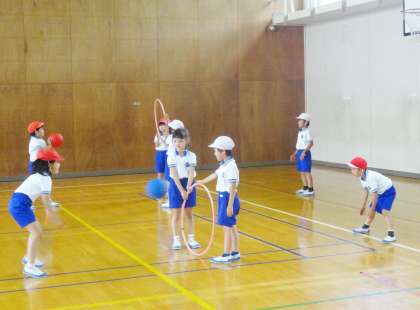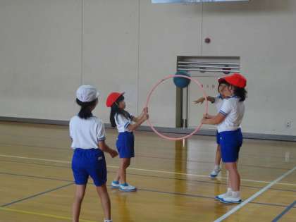 2年生は、体育で、フラフープを利用したボール運動をしていました。