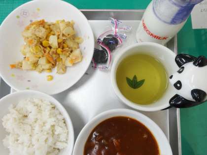 麦ごはん 牛乳 えがおのハヤシシチュー コロコロポテトサラダ プルーン
