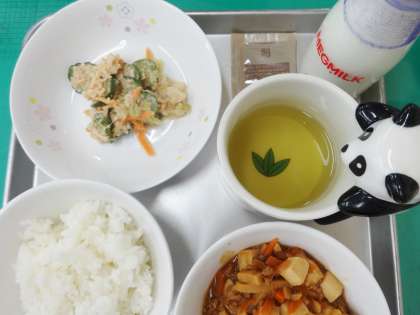 ごはん 牛乳 マーボ豆腐 バンバンジーサラダ ココアパウダー