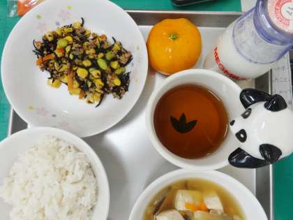 麦ごはん 牛乳 五目汁 ひじき入り豚そぼろ 冷凍みかん
