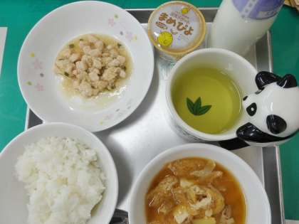 ごはん 牛乳 スタミナ汁 鶏肉のみぞれ煮 豆乳デザート