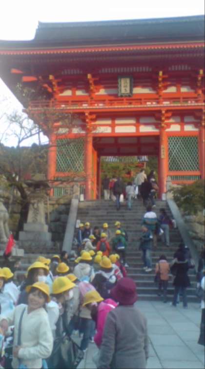 清水寺に着きました。バスガイドさんの案内で見学中です。この後、夕食を「太陽楼」でとり、京都タワーに向かいます。