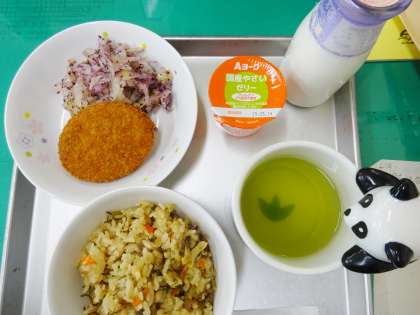 ふきごはん 牛乳 コロッケ キャベツのゆかり和え 野菜ゼリー
