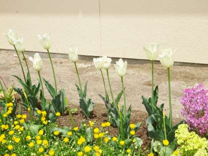 4組の前の花壇に、チューリップがきれいに咲いていました。