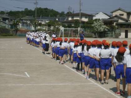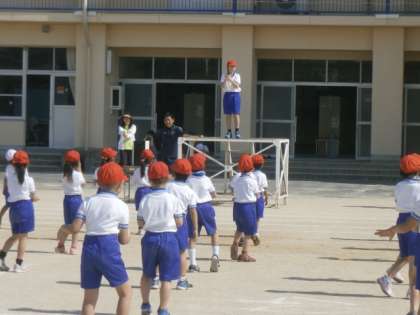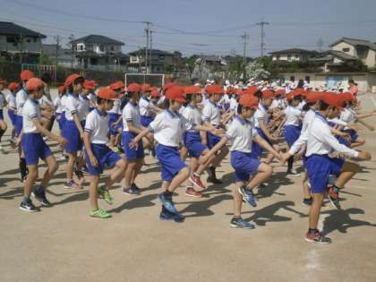 今日の業前時間の運動会全体練習は、昨日に続き、準備運動と控え席への移動練習を行いました。