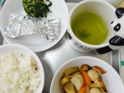 麦ごはん 牛乳 関東煮 さば銀紙焼き 小松菜のなめたけ和え