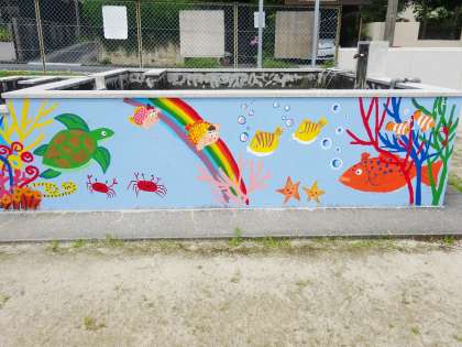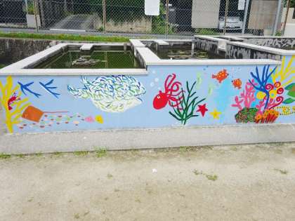見守り隊の人たちの子どもたちの交通安全の願いを込めた観察池の壁画が完成しました。東側の様子です。