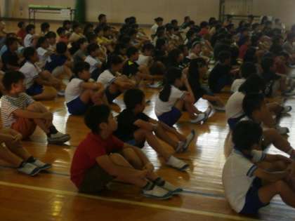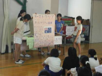 5時間目に体育館で、6年生が総合的な学習の時間などで、学習してきた海外の国の様子を3〜5年生の前で、発表する会がありました。全体での話のあと、6年生がグループごとにわかれて、発表をしました。