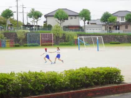 3年生は、体育で、バトンわたしの練習をしていました。