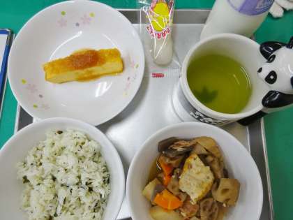 わかめごはん 牛乳 さといもとれんこんのうま煮  厚焼き卵のおろしだれかけ(すずき入りはんぺんのおろしだれ) 月見団子
