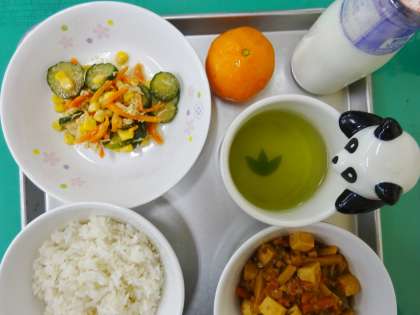 麦ごはん 牛乳 マーボ豆腐 バンバンジーサラダ 冷凍みかん