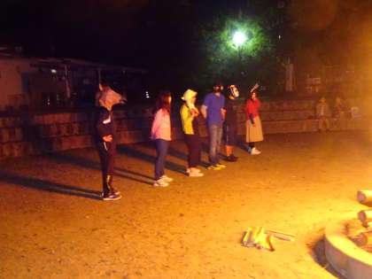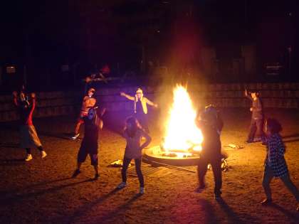 キャンプファイヤーで、子どもたちの緊張を和らがせるために、職員の出し物がありました。