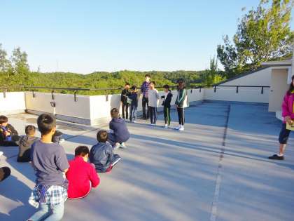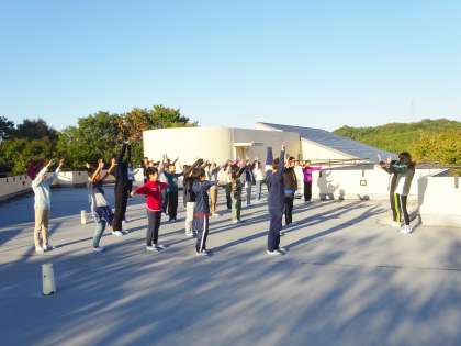 朝の集いです。英語バージョンのラジオ体操をしました。